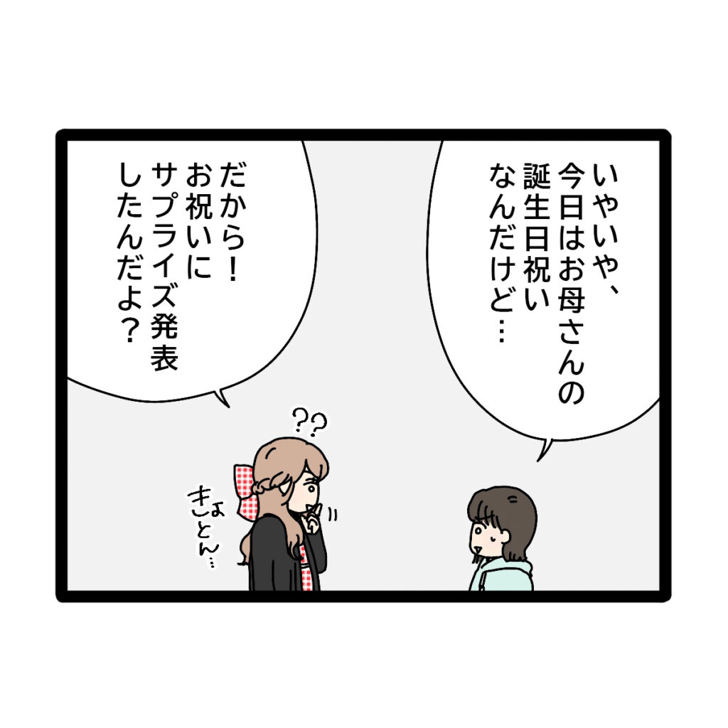 「いやいや、今日はお母さんの誕生日祝いなんだけど・・」と言うと、「だから!お祝いにサプライズ発表したんだよ?」何も分からず、きょとんとした顔できみこがそう言いました。