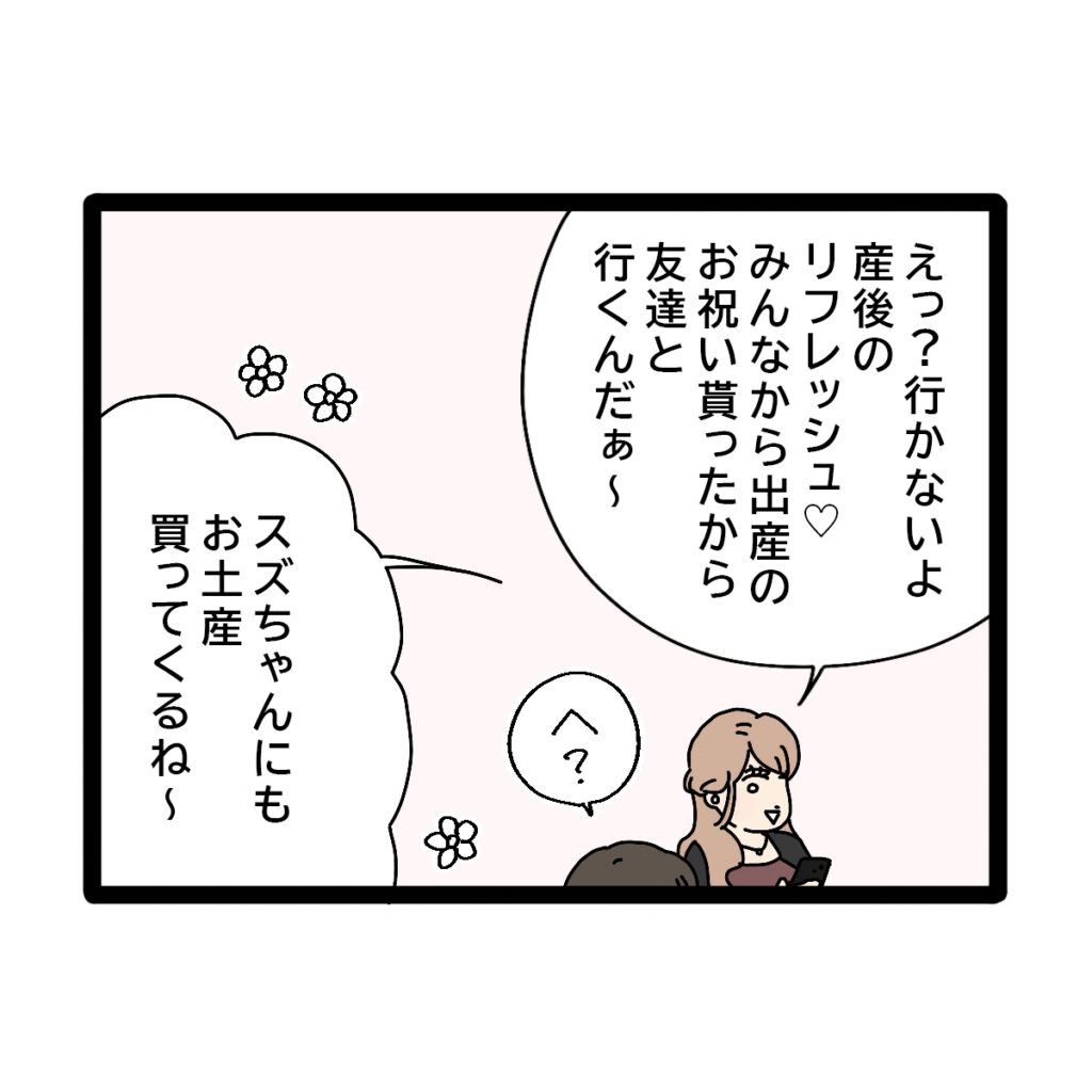 「えっ?行かないよ。産後のリフレッシュ。みんなから出産のお祝い貰ったから、友達と行くんだぁ~」と嬉しそうなきみこに「へ?」と思わず呟く私。「スズちゃんにもお土産買ってくるね~」平然ときみこが言いました。