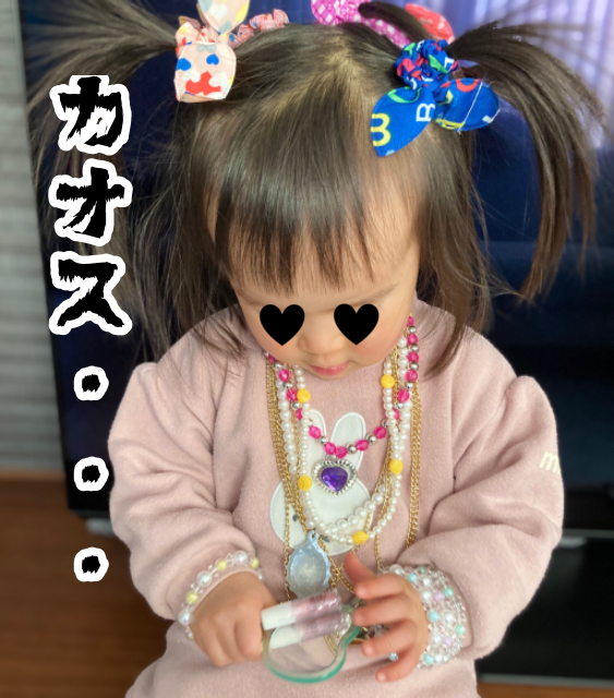 ヤバめのファッションモンスター爆誕(汗)キラキラアクセサリーに魅了された2歳娘がカオス|アツアゲの育児絵日記