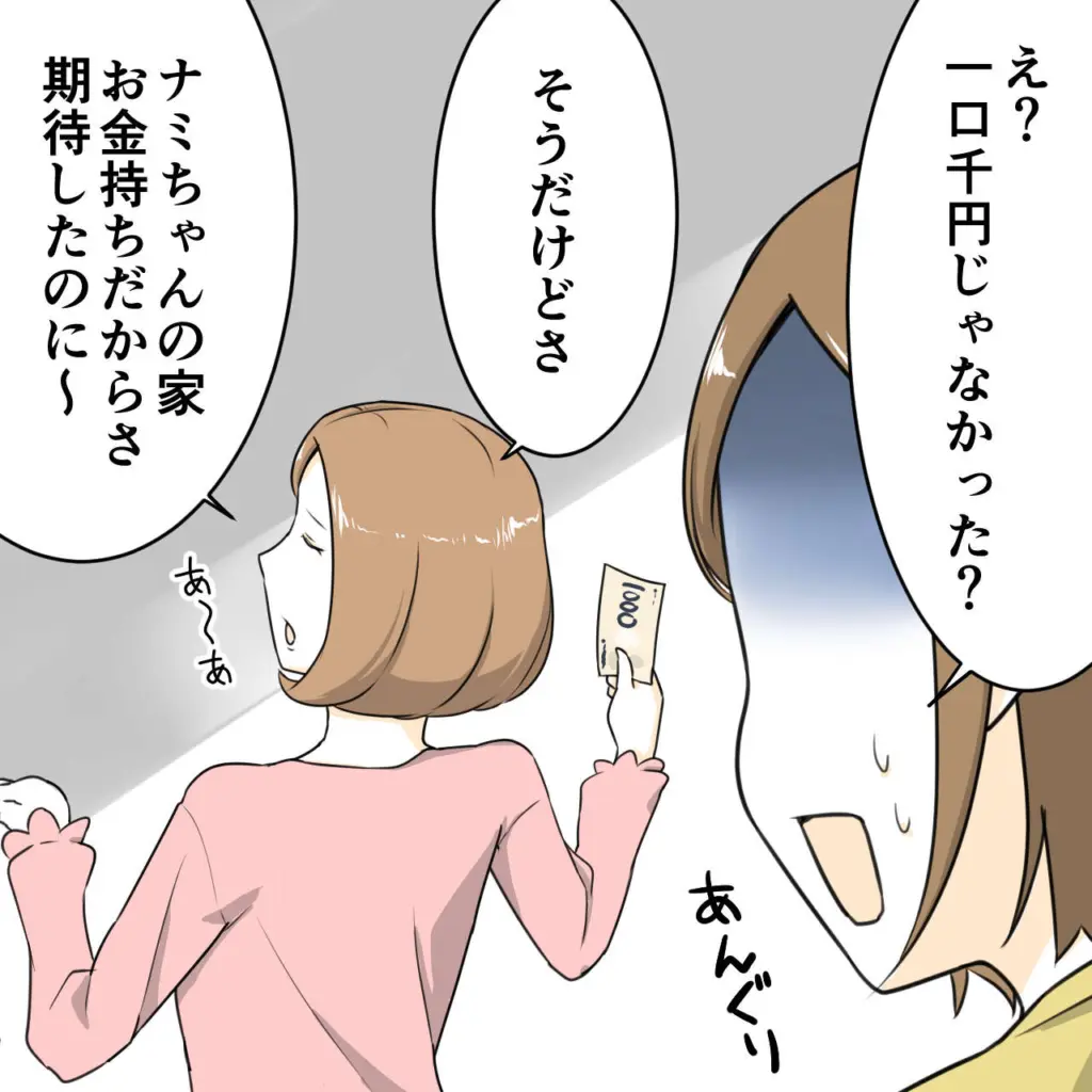 「え?一口千円じゃなかった?」口をあんぐり開けて問い返すと、ハルちゃんママは「そうだけどさ、ナミちゃんの家お金持ちだから期待したのに~」と残念そうに言いました。貰っておいてこの態度って・・・一体この人はどういう神経をしているのでしょうか。