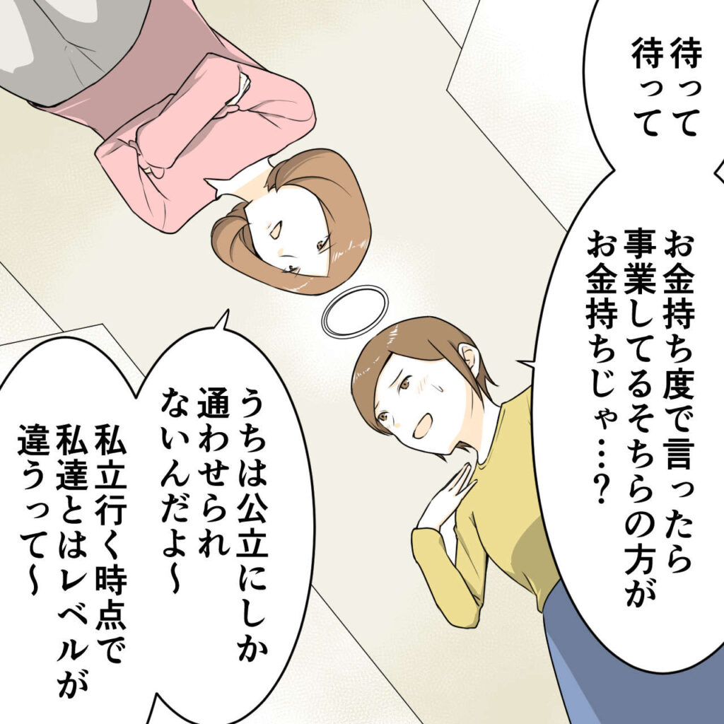 「待って待って、お金持ち度で言ったら事業してるそちらの方がお金持ちじゃ?」私がそう返すと、ハルちゃんママは「うちは公立にしか通わせられないんだよ、私立に行ける時点で私たちとはレベルが違うって~」と、よく分からない理屈を当然のように主張してきました。