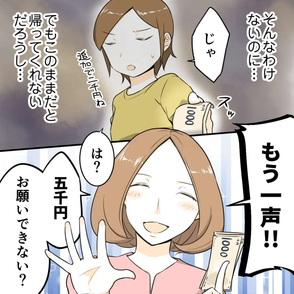 そんなわけないのに、でもこのままだと帰ってくれないだろうし・・・私は渋々ながらも、追加で二千円を渡します。しかし、ハルちゃんママはそれでも納得がいかないようで、「もう一声!五千円お願いできない?」と厚かましく聞いてきました。