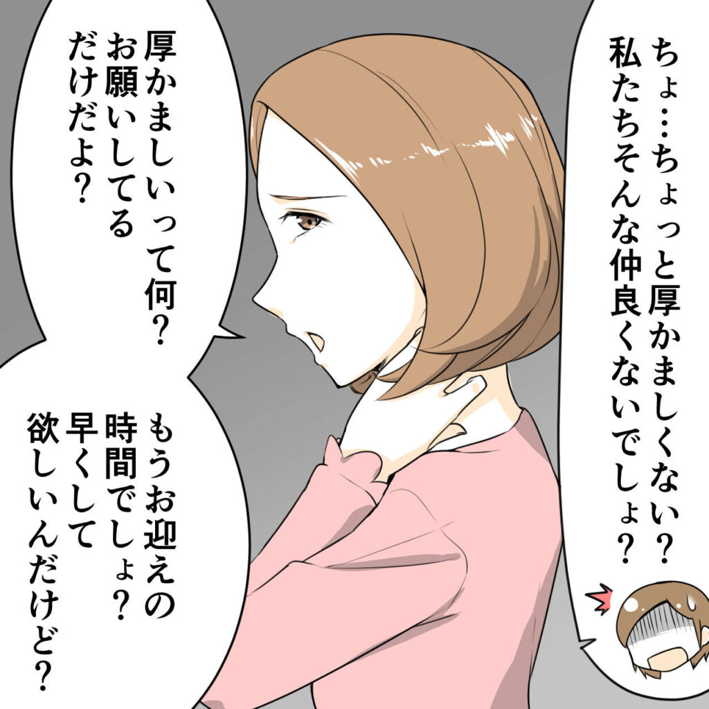 「ちょ、ちょっと厚かましくない?私たちそんな仲良くないでしょ?」あまりの図々しさに、私は思わず本音を口にしてしまいました。するとハルちゃんママは迷惑そうな顔をして、「厚かましいって何?お願いしてるだけだよ?もうお迎えの時間でしょ?早くして欲しいんだけど?」と、カンパを頼む立場とは思えない態度で言い放ちました。