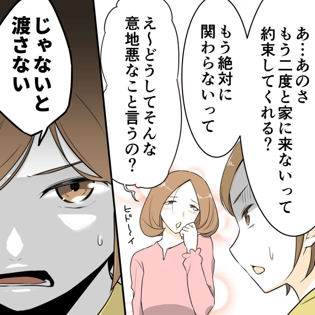 ダメだ。まともに向き合えば向き合うほど、こちらが消耗する。そう悟った私は、「もう二度と家に来ない、もう絶対に関わらないって約束してくれる?じゃないと渡さない」と交換条件を突きつけました。ハルちゃんママは「え~、どうしてそんな意地悪なこと言うの?」と涙目で言いましたが、そんな手は通じません。一刻も早く、この人と縁を切らなければ!
