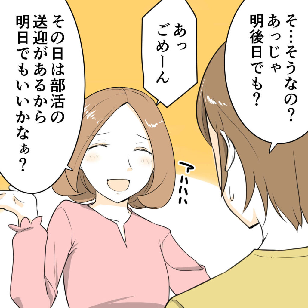 なんだか私が迷惑をかけているような気分になってしまい「そ・・そうなの?あっじゃあ明後日でも?」と言うと、ハルちゃんママは「あっ、ごめーん。その日は部活の送迎があるから明日でもいいかなぁ?」と笑顔でごり押し。
