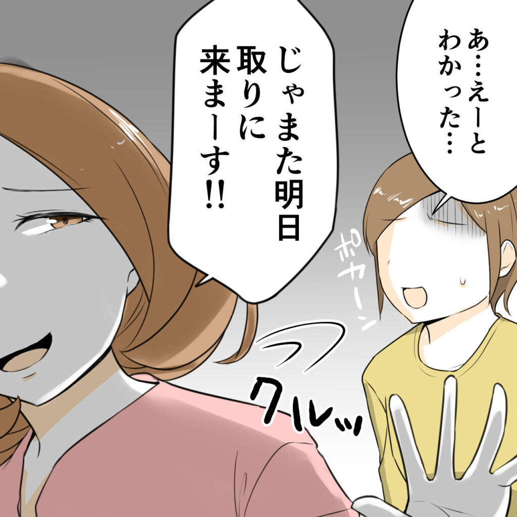 すると、ハルちゃんママは「あっ、そうだよね!」と納得してくれたと思いきや、「また取りに来るから準備してもらえる?」と言ってきました。まさか出直してくるとは思っていなかった私は、焦って「えっ?あっ・・えっと・・週末でもいい?」と言ってしまいました。