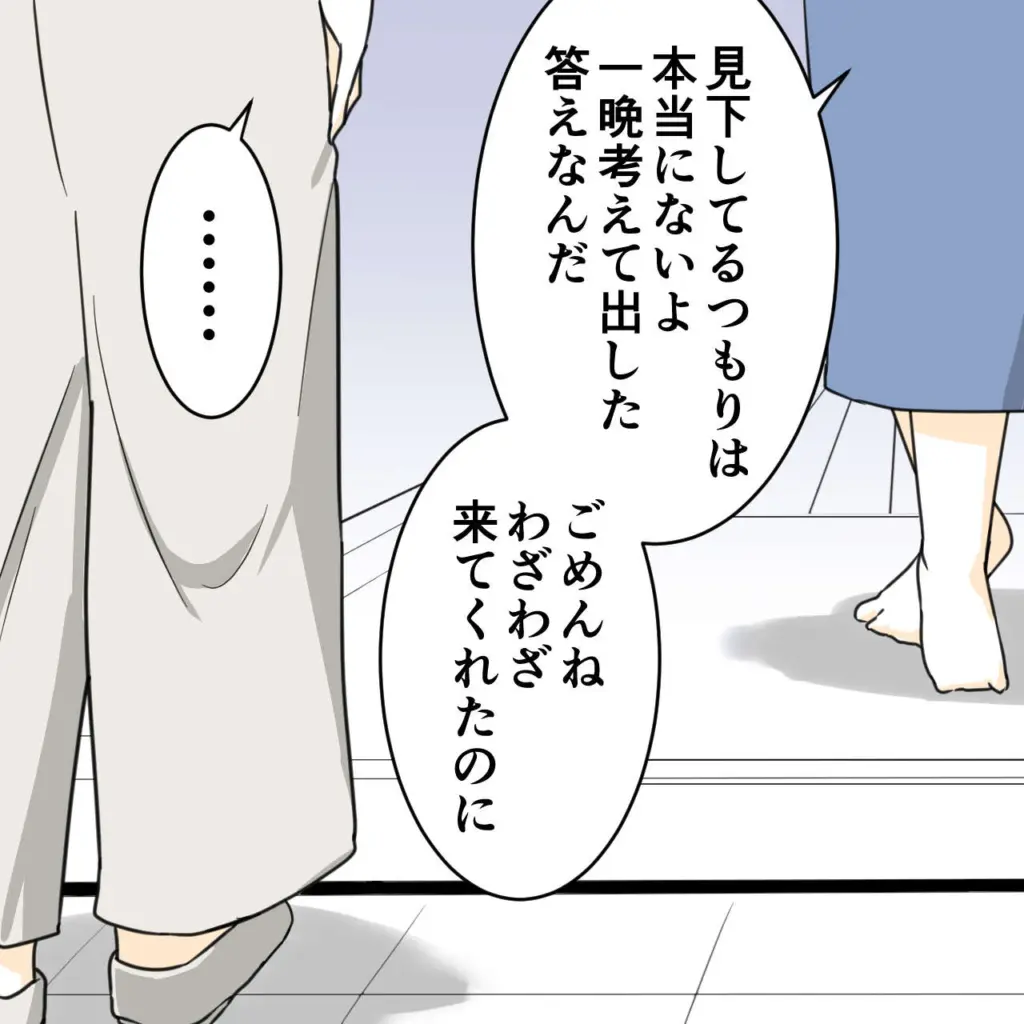 そんなことを言われるとは思っていなかった私は驚きつつも「見下してるつもりは本当にないよ。一晩考えて出した答えなんだ。ごめんね、わざわざ来てくれたのに」と冷静に伝えると、しばらく考えるように無言になったハルちゃんママ。