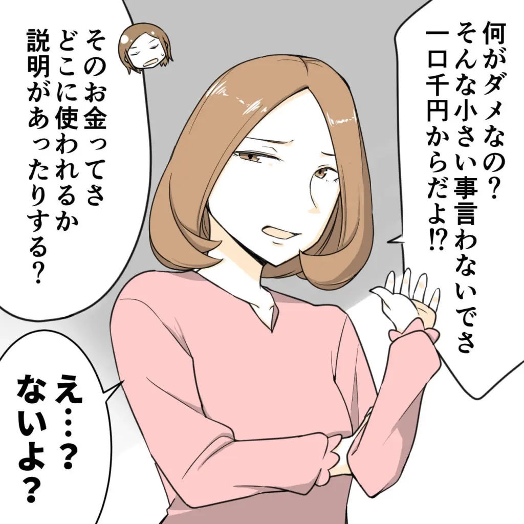 すると、ハルちゃんママは少しの間のあと「何がダメなの?そんな小さい事言わないでさ、一口千円からだよ!?」とやれやれといった感じでため息まじりに言いました。なんで寄付を依頼している立場のハルちゃんママからこんな上から目線で言われないといけないのでしょうか。モヤモヤが募っていた私は、「そのお金ってさ、どこに使われるか説明があったりする?」と少し突っ込んで聞いてみました。すると、ハルちゃんママは「え・・?ないよ?」とさらり。
