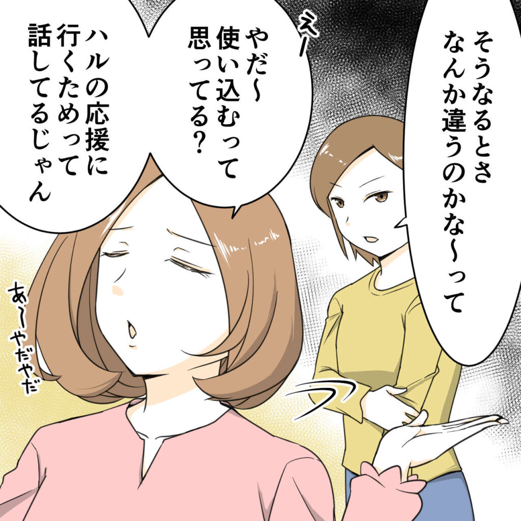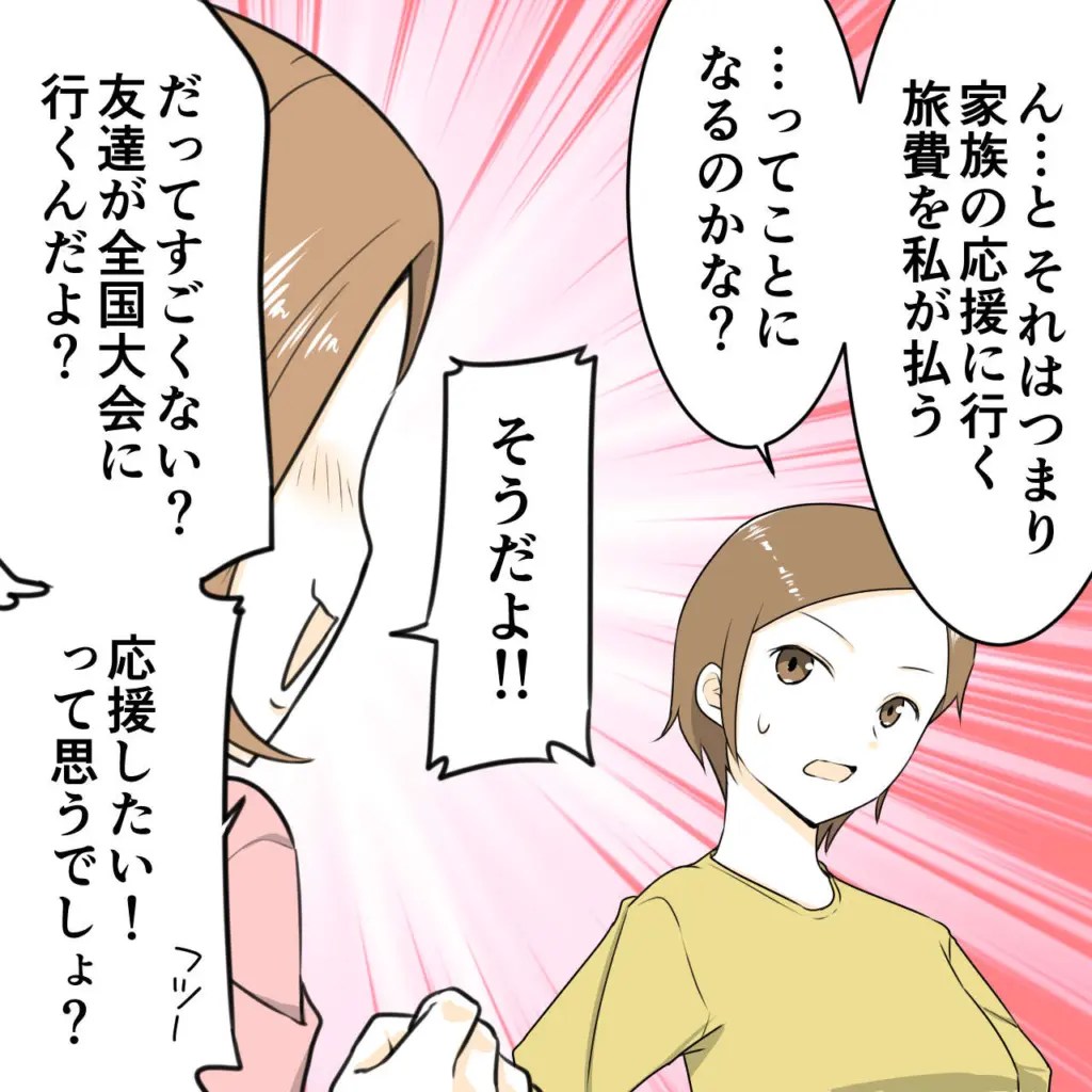 「ん・・と、それはつまり、家族の応援に行く旅費を私が払う・・ってことになるのかな?」と再確認すると、「そうだよ!!だってすごくない?友達が全国大会に行くんだよ?応援したい!って思うでしょ?フツー」とハルちゃんママは前のめりで興奮気味に言いました。