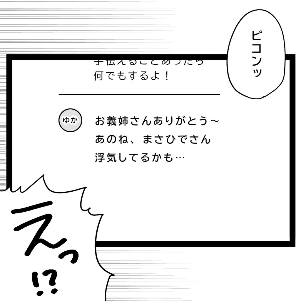すると、ゆかちゃんから返って来たのは予想外の内容でした。「お義姉さんありがとう~。あのね、まさひでさん、浮気してるかも・・」驚きすぎて思わず「えっ!?」と声が出てしまいました。