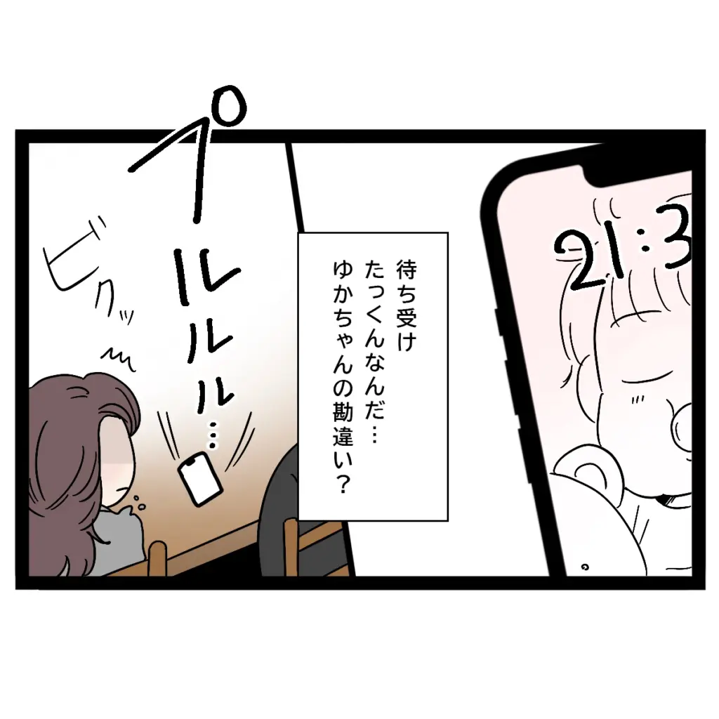 無防備にテーブルに置かれたまさひでのスマホが目に入りました。待ち受け画面はたっくんの寝顔。まさひでのたっくんへの愛情が伝わってきて、ゆかちゃんの勘違いなのでは?と思っていたその時、プルルルと着信が。