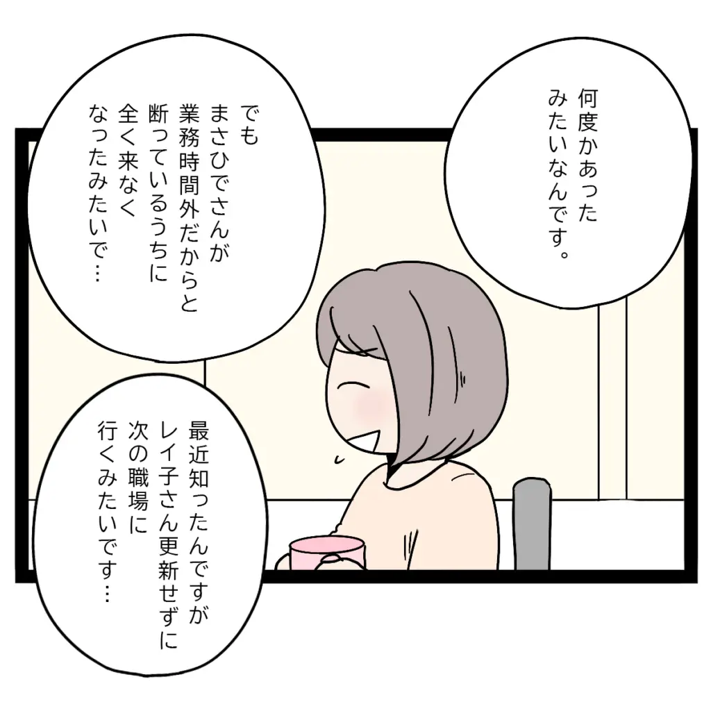 ゆかちゃんは困ったように笑いながら、レイ子から何度か連絡があったこと、だけどまさひでが業務時間外だからと断っているうちに連絡が途絶えたことを話してくれました。「最近知ったんですが、レイ子さん更新せずに、次の職場に行くみたいです」そう話すゆかちゃんは、どこかホッとしたような表情をしていました。