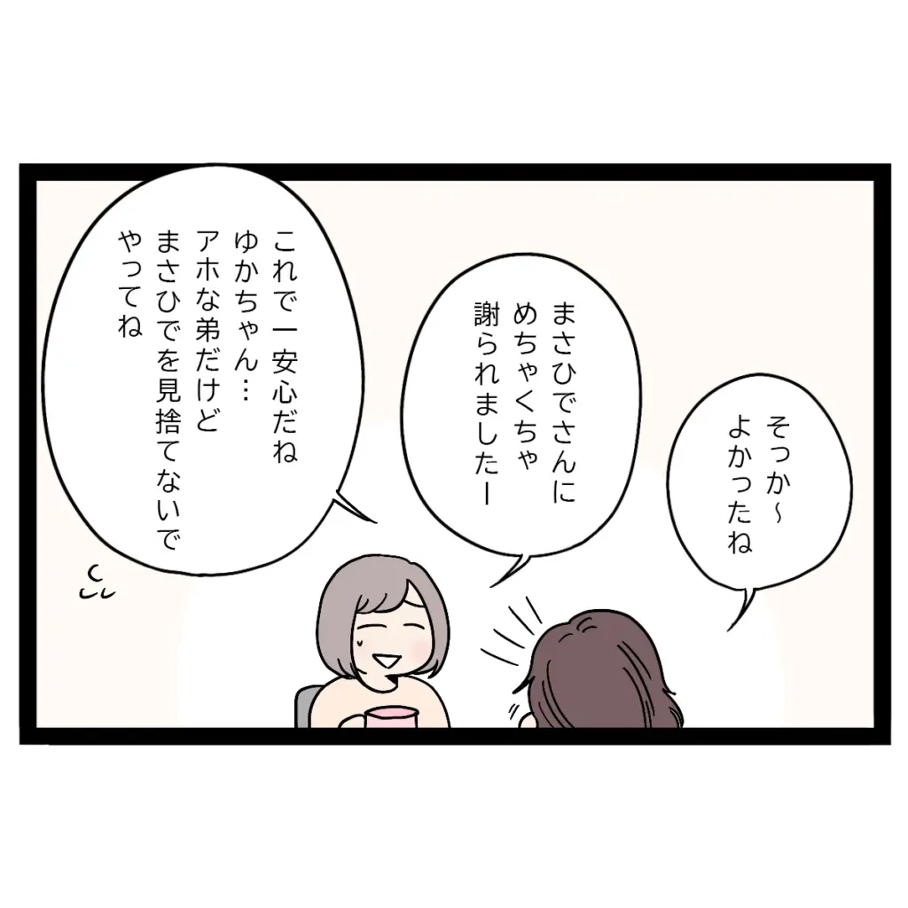 「そっか~よかったね」私は心の中で、まさひでやるじゃん!とガッツポーズ。これで正真正銘ひと安心です。「まさひでさんにめちゃくちゃ謝られました」と笑うゆかちゃんに、私は「アホな弟だけど、まさひでのこと見捨てないでやってね」とお願いしました。