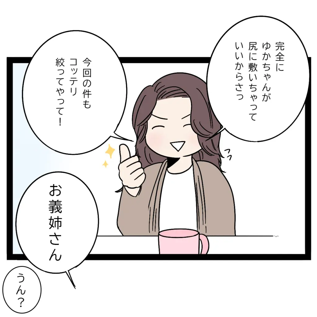 「完全にゆかちゃんが尻に敷いちゃっていいからさっ、今回の件もコッテリ絞ってやって!」そう言って親指を立てて笑っていると、ゆかちゃんが突然「お義姉さん」と私を呼びました。