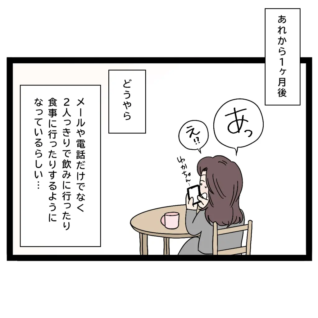 ・・・あれから1か月後、私のもとに、ゆかちゃんから泣きつくようなメッセージが届きました。どうやら、まさひでとレイ子さんはメールや電話では飽き足らず、仕事終わりに2人きりで飲みに行ったり、食事に行ったりするようになってしまったようです。