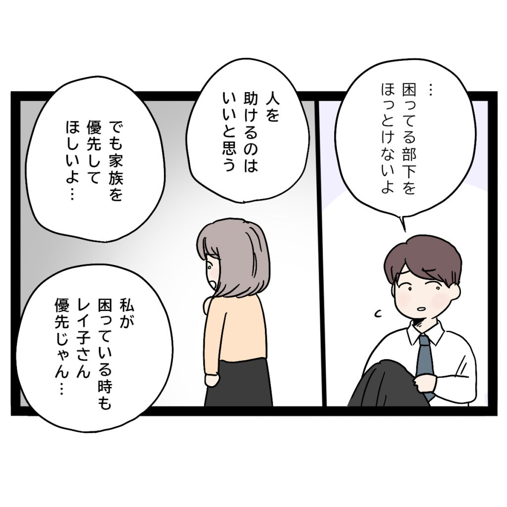 初めて部下に頼られたことがよほど嬉しいのか、あるいは男として頼られたいという気持ちがあるのか、「困っている部下を放っておけないよ」と言います。しかしゆかちゃんは、「人を助けるのはいいと思う、でも家族を優先してほしい、私が困っている時もレイ子さん優先じゃん」と家族が後回しになっている事実を伝えました。