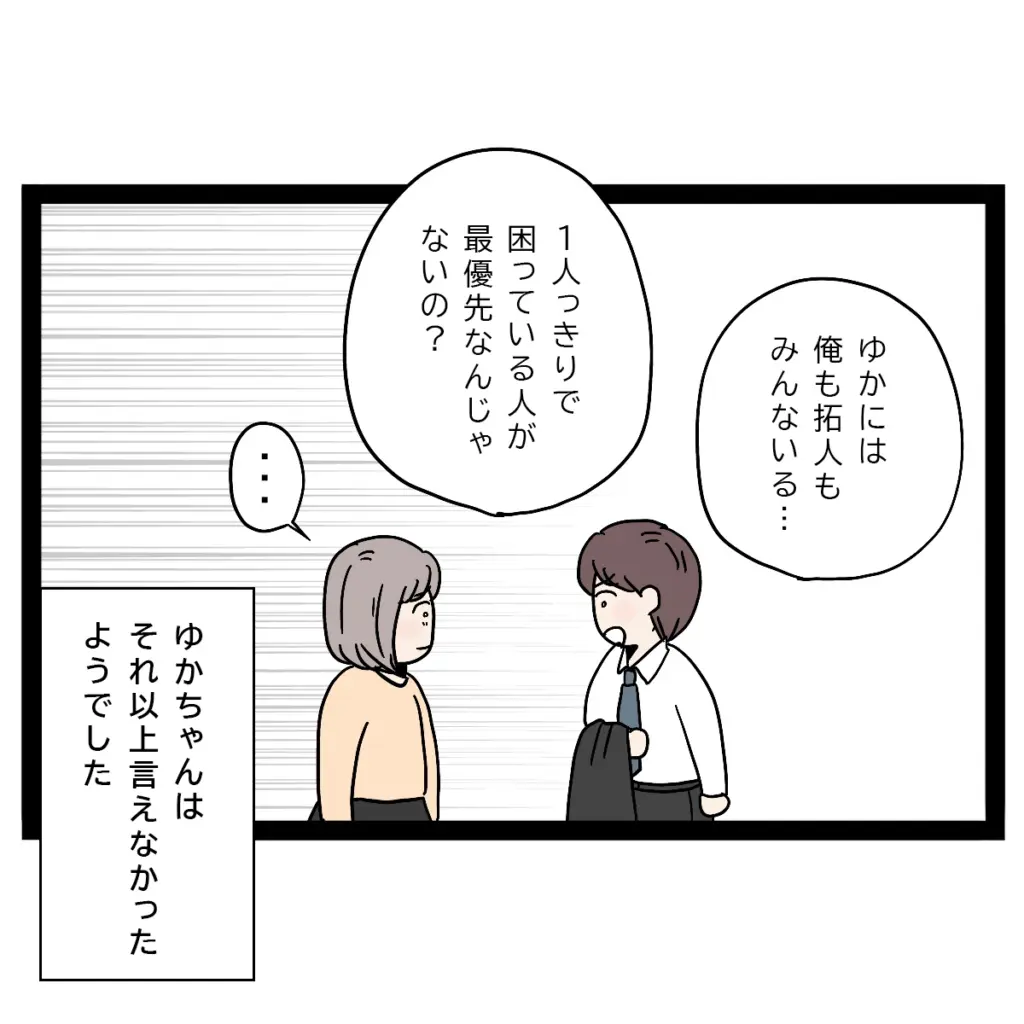 すると「ゆかには俺も拓人もみんないる、1人っきりで困っている人が最優先なんじゃないの?」と言い張るまさひで。ゆかちゃんはその言葉を聞いた瞬間、この人は家族とレイ子さんを同じ土俵に並べているから優先順位がおかしいんだと悟りました。もう、何を言ってもわかってくれないかも・・・そう思ったゆかちゃんは、それ以上言うことをやめました。