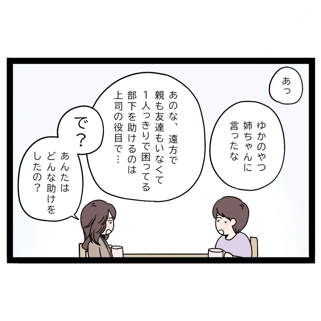 まさひでは「あっ。ゆかのやつ、姉ちゃんに言ったな」と呟いたかと思うと、「あのな、遠方で親も友達もいなくて1人っきりで困ってる部下を助けるのは上司の役目で・・」ともっともらしく説明し始めたので、私はまさひでの言葉を遮って「で?あんたはどんな助けをしたの?」と詰め寄りました。