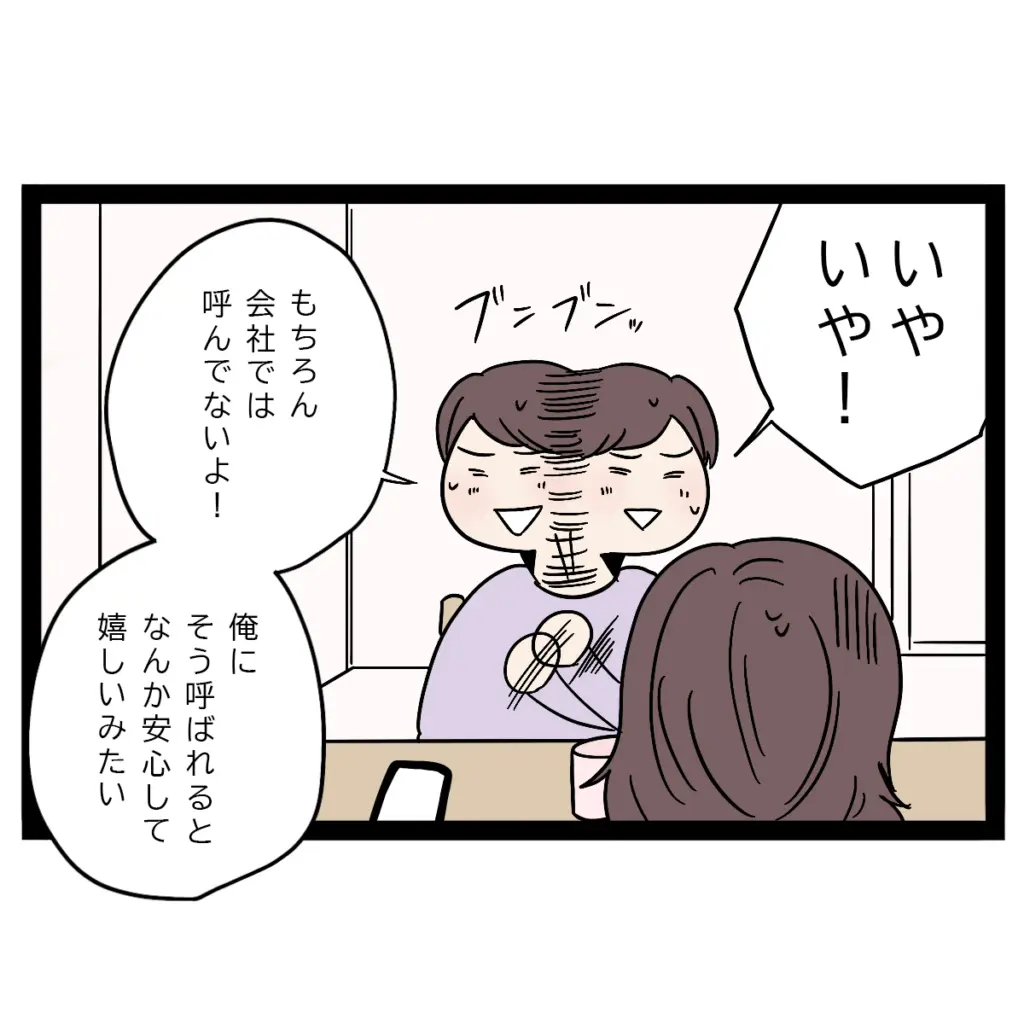 「いやいや!もちろん会社では呼んでないよ!俺にそう呼ばれるとなんか安心して嬉しいみたい」と嬉しそうに言い訳するまさひで。