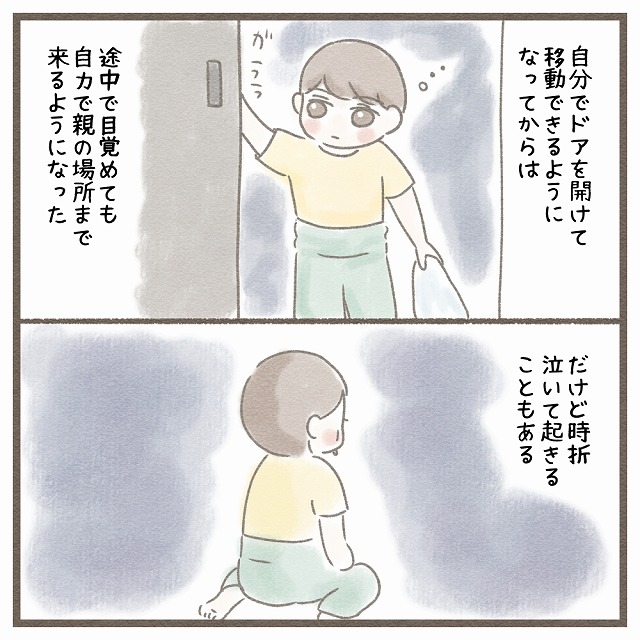 0歳は授乳やおむつ替えの度に起きるのが大変でしたが、1歳ごろにはそれもなくなりました。2歳ごろまでは早朝に泣いてしまうことも多かったのが、最近はめったに泣いて起きることはありません。