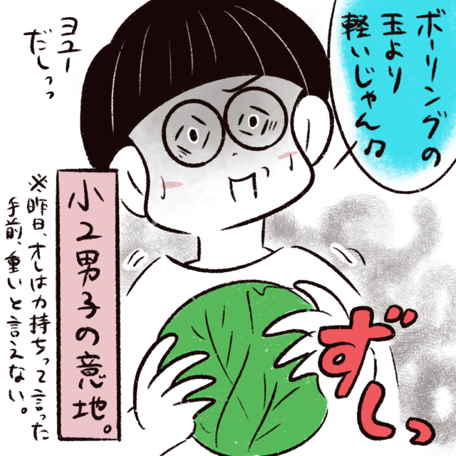 小2の息子アキくんのリクエストに応えてキャベツを買ってきたまるさんが千切りキャベツを出すと、なぜか怒って号泣したアキくん。その理由は「オレはキャベツ丸ごとかじりたかったの!!」というまさかのもので・・・。重いしキャベツ一玉なんてかじれないと説得するも、どうしても丸かじりしたいと譲らないアキくん。まるさんは翌日またキャベツを買ってくる約束をして・・・。