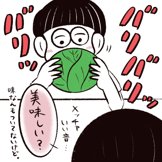 そして味もなんもついていない洗っただけのキャベツを渡すと、バリバリとかぶりついたアキ。