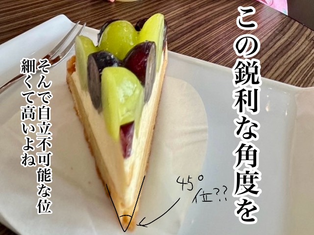 45度くらい?お高いケーキの先端はなぜかみんな鋭利な気がする|アツアゲの育児絵日記 2024年09月19日 3歳のマチ子ちゃんのママであるアツアゲさんから、ケーキのお話です。 鋭利なケーキの法則 分かるかい? この攻めた角度を・・・。 ———– [作者]アツアゲ 完全核家族で日々変態家族の日常をSNSで綴っています。 [編集コメント]ママ広場編集部 あはは!たしかに鋭利です!そして、とっても美味しそう! この記事をSHAREする この記事のカテゴリー マンガ子育て園児