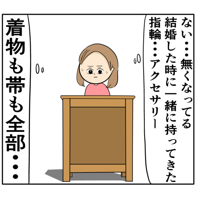 ない・・なくなってる・・。結婚した時に一緒に持ってきた指輪・・アクセサリー、着物も帯も全部・・