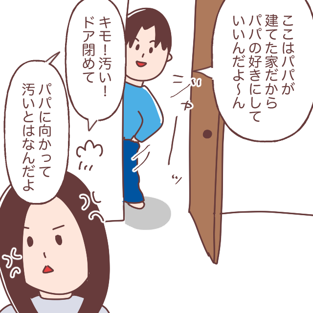 ある日、パパに腹を立てる娘ちゃんを見てママが理由を聞いてみると、家のトイレでパパがドアを全開にしたまま用を足していたそう。娘ちゃんが「ドア閉めてよ!」と言っても「ここはパパが建てた家だからパパの好きにしていいんだよ~ん」と開き直っていたと聞き、パパに注意することにしたママ。しかし、ママが注意しても「別にいいじゃん。なんで閉める必要あるの?俺は見られて困らないし」と娘ちゃんがなぜ怒っているのかさっぱり分からないパパは真剣に取り合ってくれません。嫌がっている娘ちゃんの気持ちを汲もうとしないパパにママも呆れてしまいます。