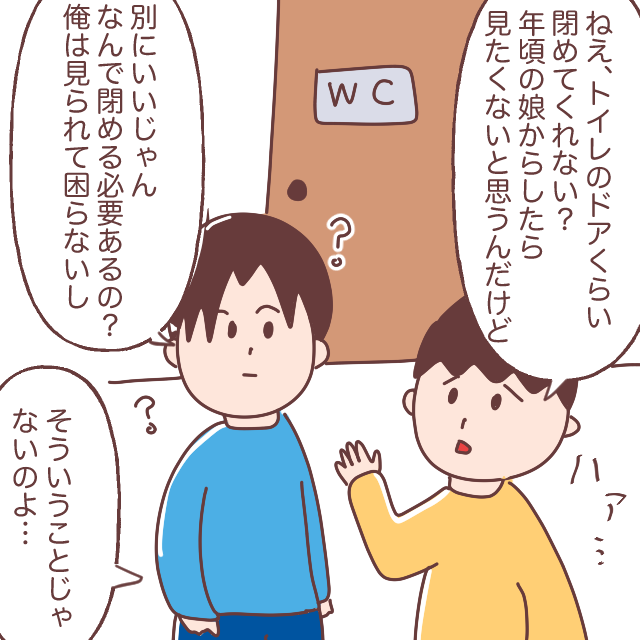 「トイレのドアくらい閉めてくれない?年頃の娘からしたら見たくないと思うんだけど」と夫に伝えると、夫は「別にいいじゃん。なんで閉める必要あるの?俺は見られて困らないし」と娘の気持ちを汲もうともせず反省ゼロ。「そういうことじゃないのよ・・」と話しの伝わらない夫に溜息が出ます。