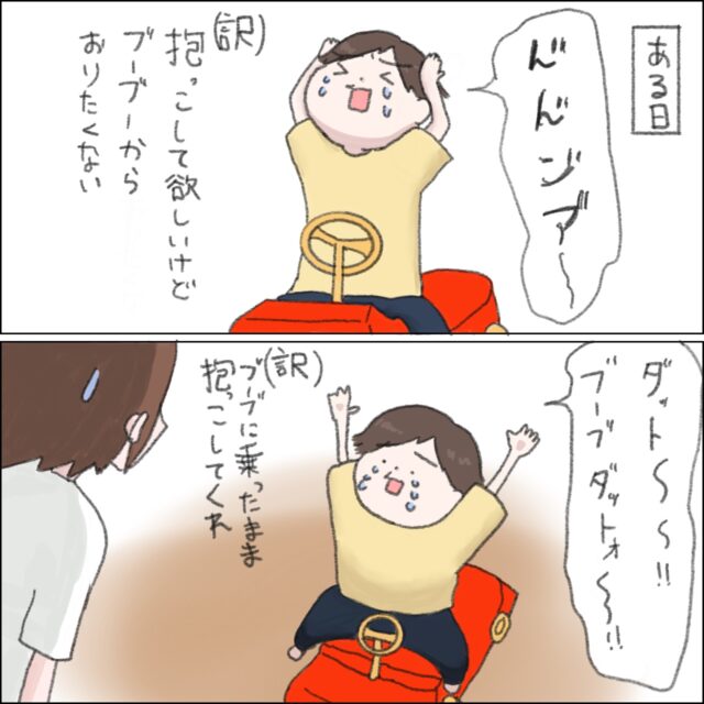 この時はブーブーに夢中で降りたくなかったみたいです。