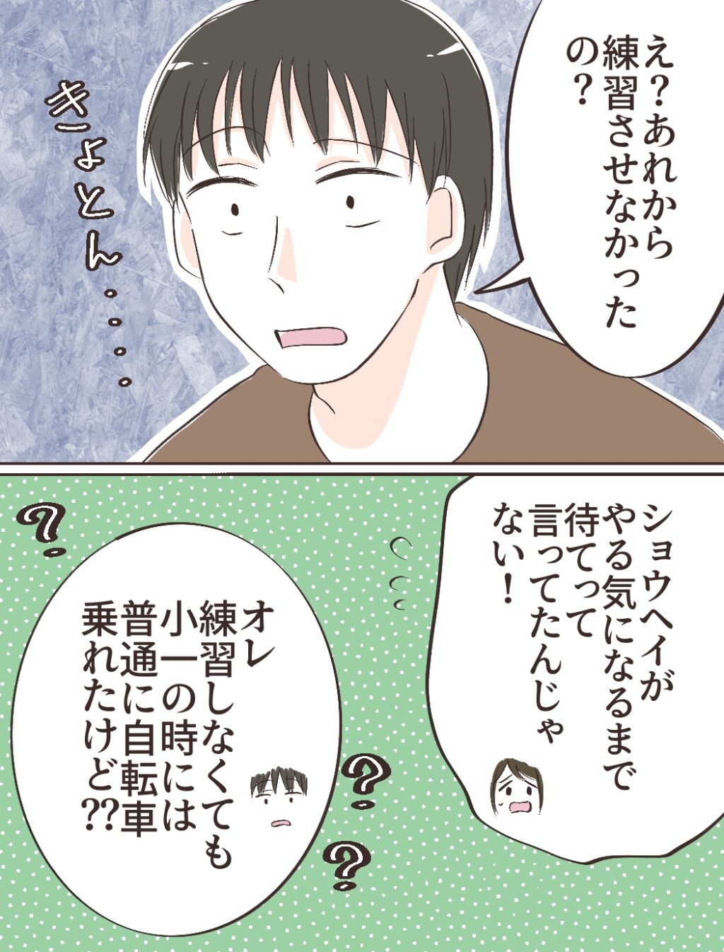 私の話を聞いてまだキョトンとしているショウヘイ。「あれから練習させなかったの?」と言われ、「ショウヘイがやる気になるまで待てって言ってたんじゃない!」というと、「オレ練習しなくても小1の時には普通に自転車乗れたけど?」と当然のようにショウヘイは言いました。