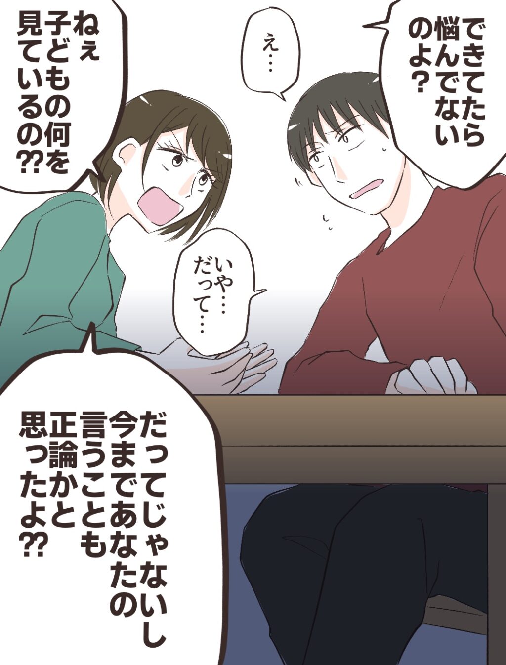 「できたら悩んでないのよ?」「ねぇ、子どもの何を見ているの??」と迫ると、「いや・・だって・・」とショウヘイは動揺。私は一気にまくし立てました。「だってじゃないし。今まであなたの言うことも正論かと思ったよ??」