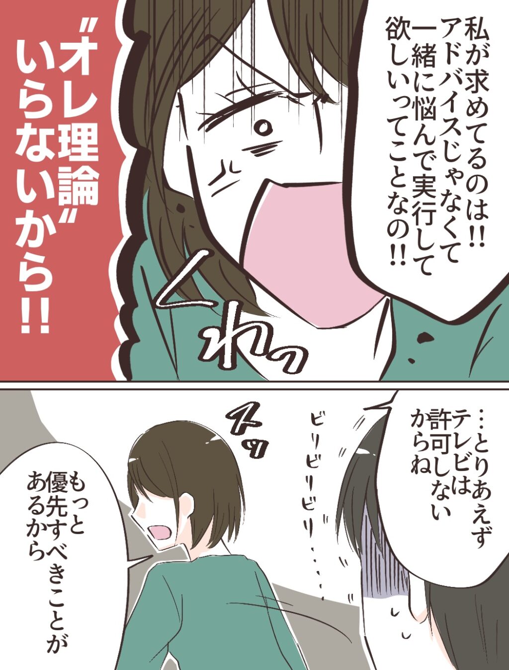 ショウヘイの「アドバイス」という言葉に私はさらにイラッ。「私が求めてるのは!!アドバイスじゃなくて、一緒に悩んで実行して欲しいってことなの!!オレ理論いらないから!!」私の勢いに驚いたのかショウヘイは何も言い返してきません。私は「・・とりあえず、テレビは許可しないからね。もっと優先すべきことがあるから」と静かにショウヘイに伝えました。