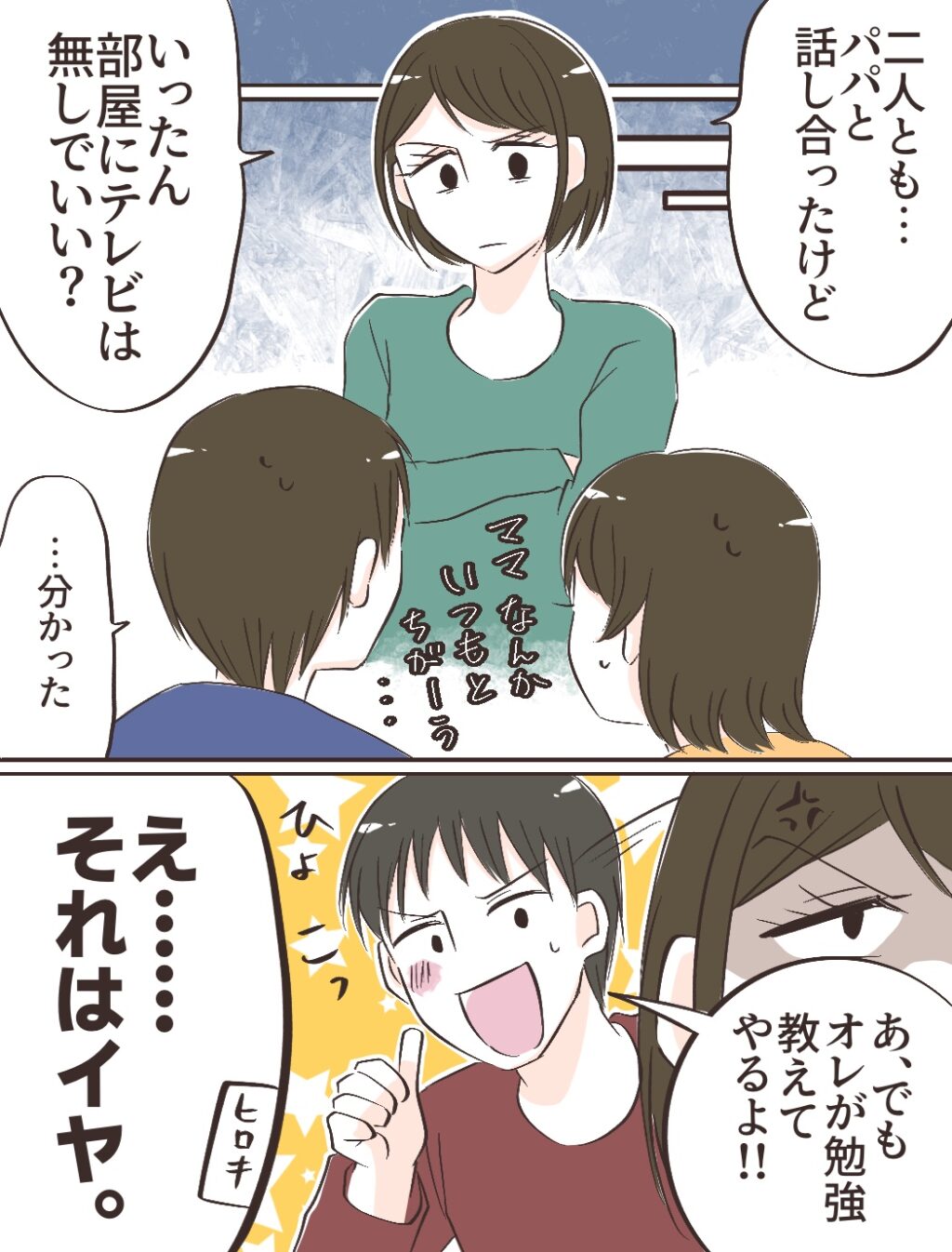 その後、子ども達に「二人とも・・パパと話し合ったけど、いったん部屋にテレビは無しでいい?」と話すと、私の様子がいつもと違うと感じ取ったようで二人とも「・・分かった」と納得してくれました。すると、私の機嫌を取ろうと思ったのかショウヘイが「あ、オレが勉強教えてやるよ!!」と得意気に言いましたが、ヒロキに「え・・それはイヤ」と即答されていました。ま、当然ですよね。