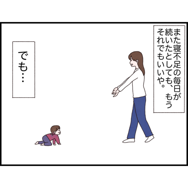 卒乳が理想だったものの、最終的には断乳を決意したしおさん。順調に進んでいき断乳完了間近と思った6日目、突然娘ちゃんがおっぱいを欲しがりしおさんは焦ります。一瞬悩んだものの「答えはひとつだろ!?あげちゃダメだろ!?」と思い直したしおさん。しかし、「ちょっとくらいあげてもいいんじゃない?」と自分の中の悪魔がささやいて「ちょっとくらいならいいか?」と気持ちが揺らいでしまいます。