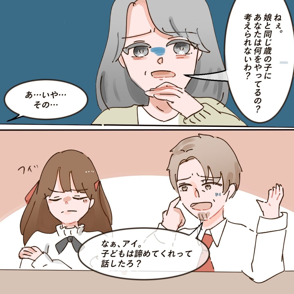 そして、「ねぇ。娘と同じ年の子にあなたは何をやってるの?考えられないわ?」そう言うと、「あ・・いや・・その・・」とやっぱりハッキリしない夫が、「なぁ、アイ。子どもは諦めてくれって話したろ?」と言うと、アイさんはフイッと知らん顔。