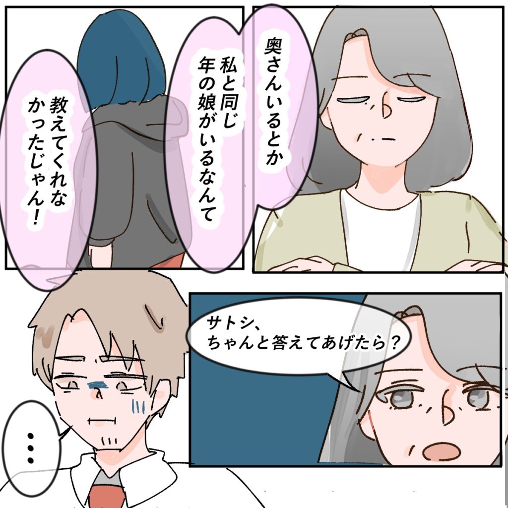 「奥さんいるとか、私と同じ年の娘がいるなんて教えてくれなかったじゃん!」アイさんの言葉を聞いて、「サトシ、ちゃんと答えてあげたら?」と私が言うと夫が言葉に詰まりました。