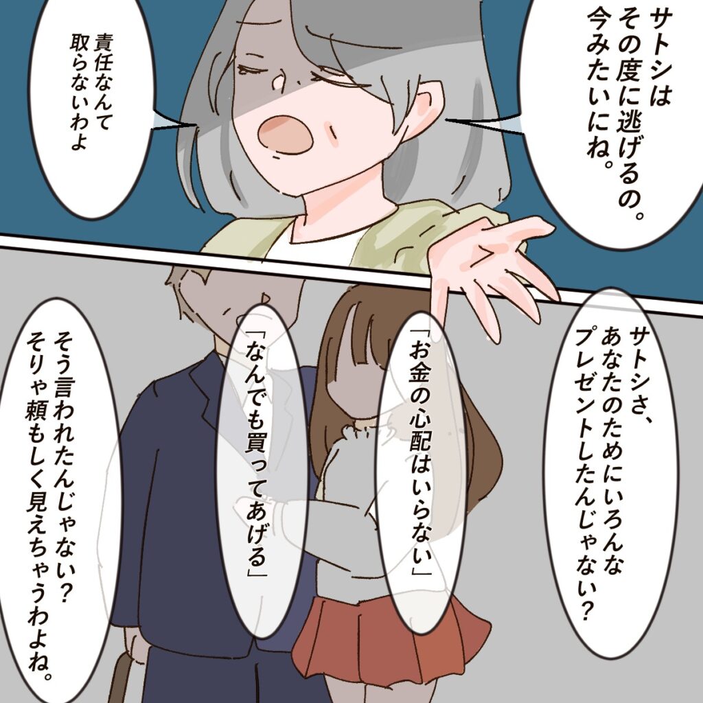 さらに、「サトシはその度に逃げるの。今みたいにね。責任なんて取らないわよ」そう言った後、「サトシさ、あなたのためにいろんなプレゼントしたんじゃない?『お金の心配はいらない』『なんでも買ってあげる』そう言われたんじゃない?そりゃ頼もしく見えちゃうわよね」そう言って、