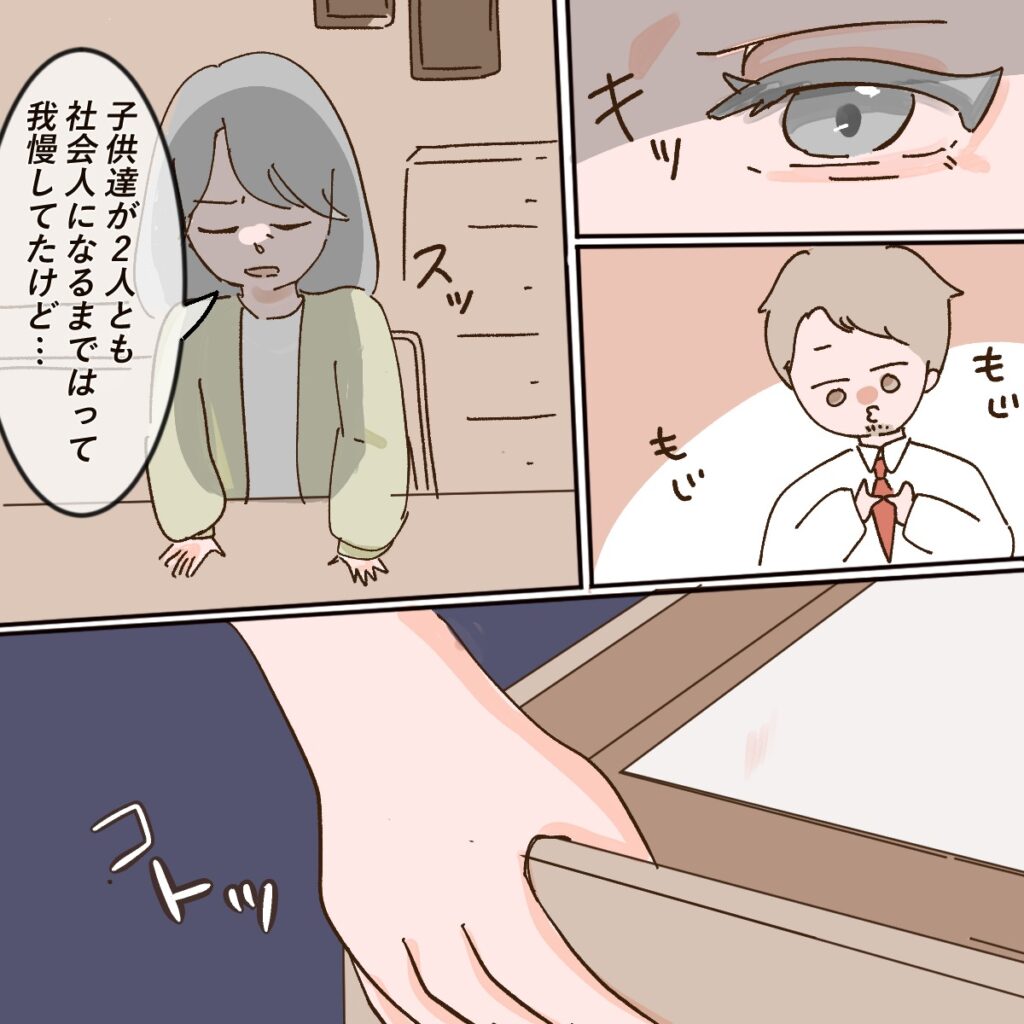 夫をキッと睨むと、まだモジモジしている夫を見て、「子ども達2人とも社会人になるまではって我慢してたけど・・」そう言って立ち上がり、引き出しを開けたのでした。