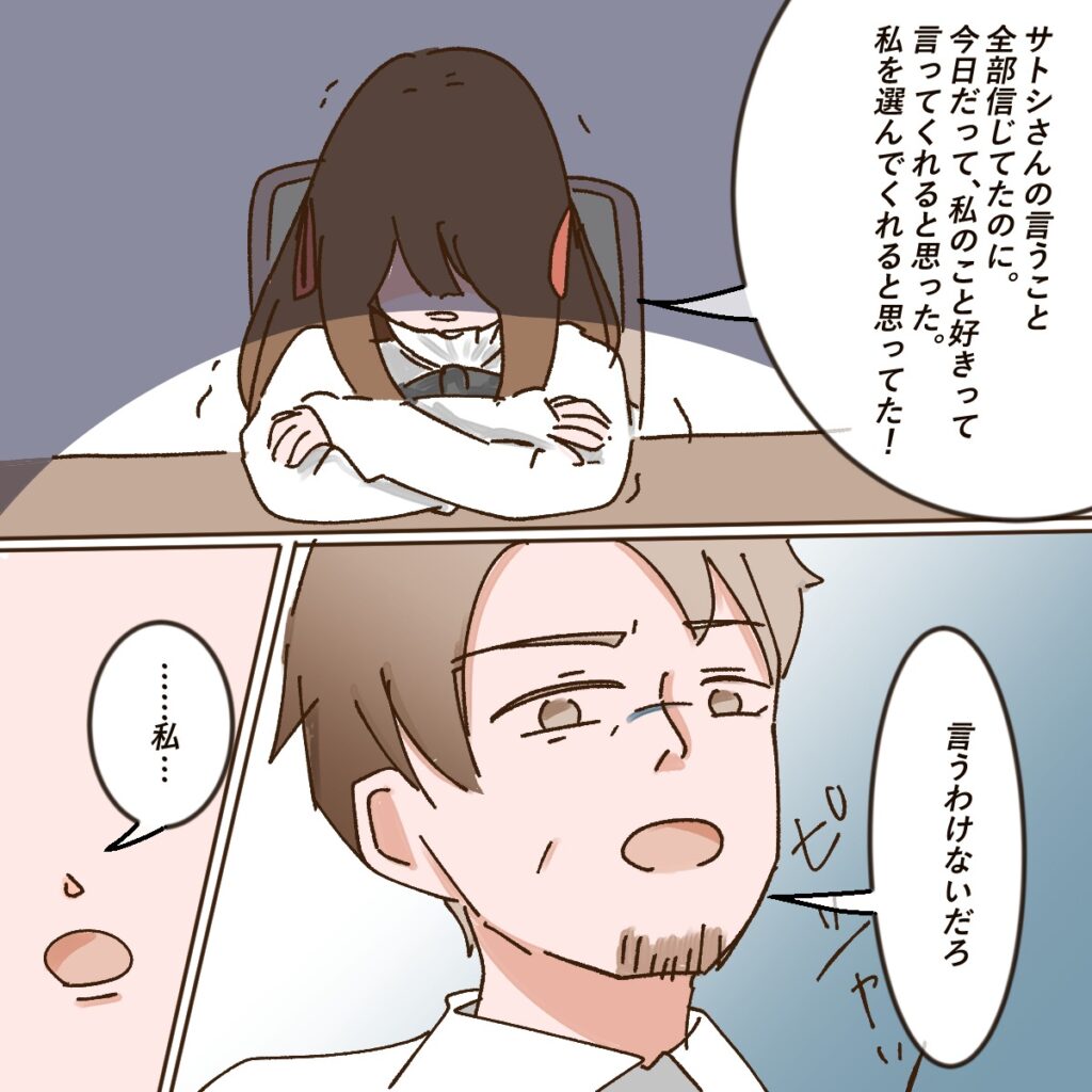 「もうウンザリ」と夫に離婚届を差し出し、アイさんに「あなたが望むものは何?」と夫がお金もほとんどなく、家もないことから、一緒にいることがどれほど大変かを伝えると、「慰謝料はもらえますよね?」と言うアイさん。それを聞いて「払うわけないじゃん」と呆れたように言う夫の言葉に、「本当に好きだったのに・・」とアイさんが落ち込みながら、「サトシさんの言うこと全部信じてたのに。今日だって、私のこと好きって言ってくれると思った。私を選んでくれると思ってた!」うつむきながらそう言うと、「言うわけないだろ」と夫が吐き捨てるように言いました。