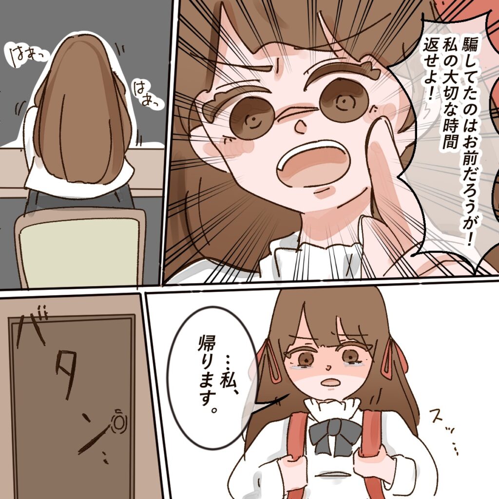すると、「騙してたのはお前だろうが!私の大切な時間返せよ!」アイさんが大きな声でそう言うと、「・・私、帰ります」そう言って立ち上がると、バタン・・とドアを開け、部屋から出て行きました。
