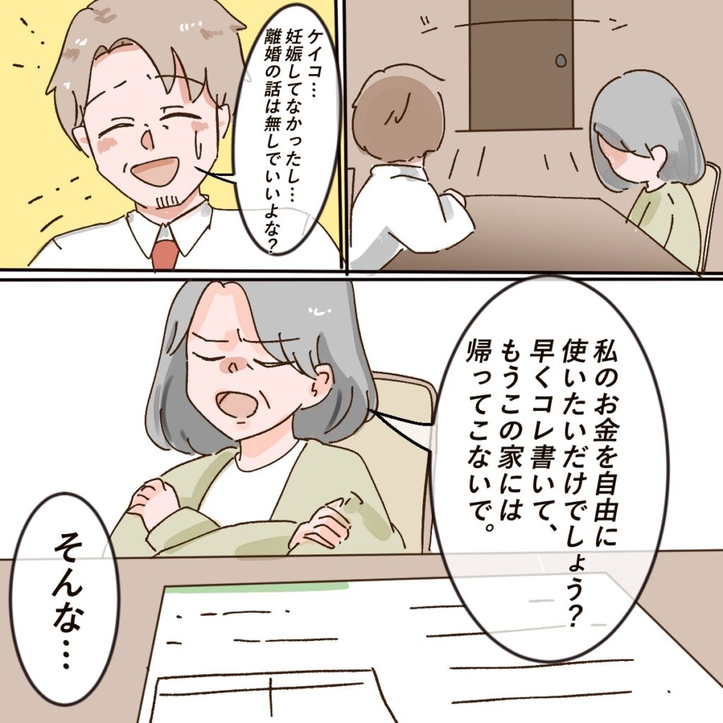 シーンとした部屋で私と夫の2人だけ。すると、「ケイコ・・妊娠してなかったし・・離婚の話は無しでいいよな?」ヘラヘラしながら言う夫に、「私のお金を自由に使いたいだけでしょう?早くコレ書いて、もうこの家には帰ってこないで」と言うと、「そんな・・」と夫は動揺しました。