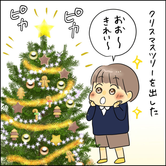 クリスマスツリーを出しました。ピカピカ光るライトを見て「おぉ~きれい~」とうっとりする息子。