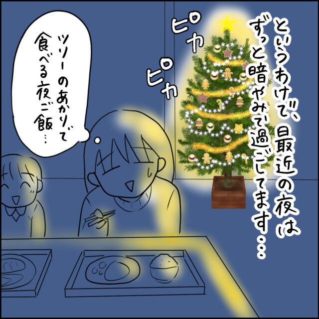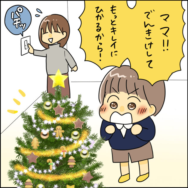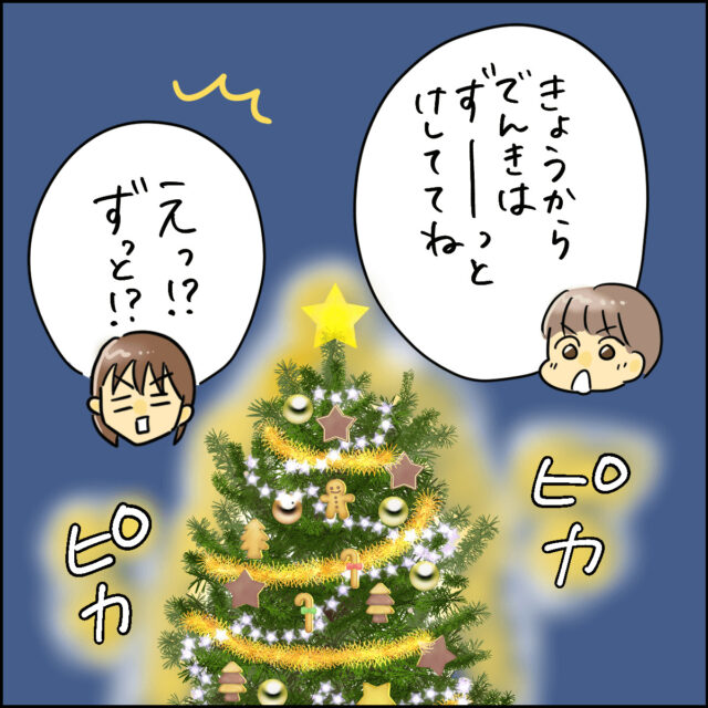 暗闇の中でピカピカきれいに光るクリスマスツリーを気に入った息子。「きょうからでんきはずーっとけしててね」とまさかのお願い。「えっ!?ずっと!?」
