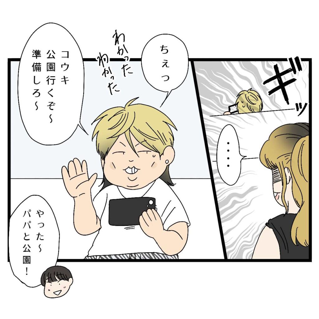 妊娠中の妻のフォローも育児もやる気がない信也さんの「頭痛い」という見え透いた嘘などまったく相手にしないサチさんは、ただ信也さんの背後に立っていました。その圧とにらみが効いたのか、信也さんは渋々コウキくんを公園へ連れていくことにしました。サチさんを怒らせたらあとが怖いことが信也さんにはよくわかっているのかもしれませんね。