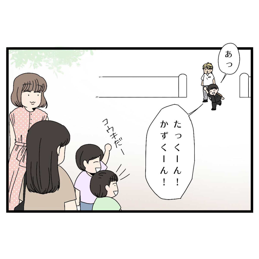 公園へ着くと、偶然お友達のたっくんとかずくんが先に来ていたので、コウキくんはますます嬉しくなって2人のところへ駆け寄りました。たっくんもかずくんも、公園にはママと来ていました。信也さんはコウキくんのお友達のママさんたちと会うのは初めてです。ママさんたちは、コウキくんと信也さんを見つけると、にこやかに声をかけてくれました。
