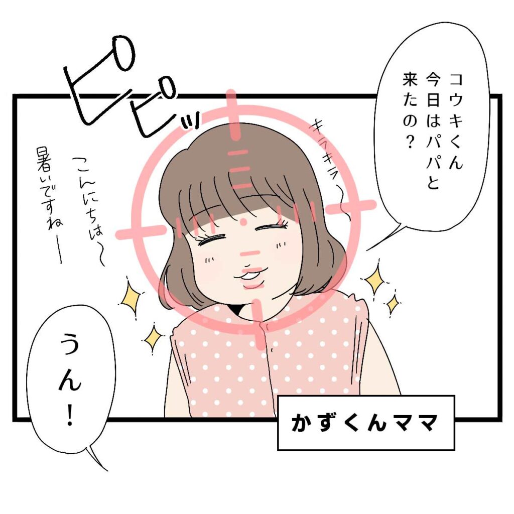 かずくんママは、ボブが似合う、おっとりしたかわいらしい感じです。「今日はパパと来たの?」とコウキくんに声をかける様子もとてもやさしそう。信也さんにも「こんにちは~。暑いですね~」とふんわりした笑顔を見せました。