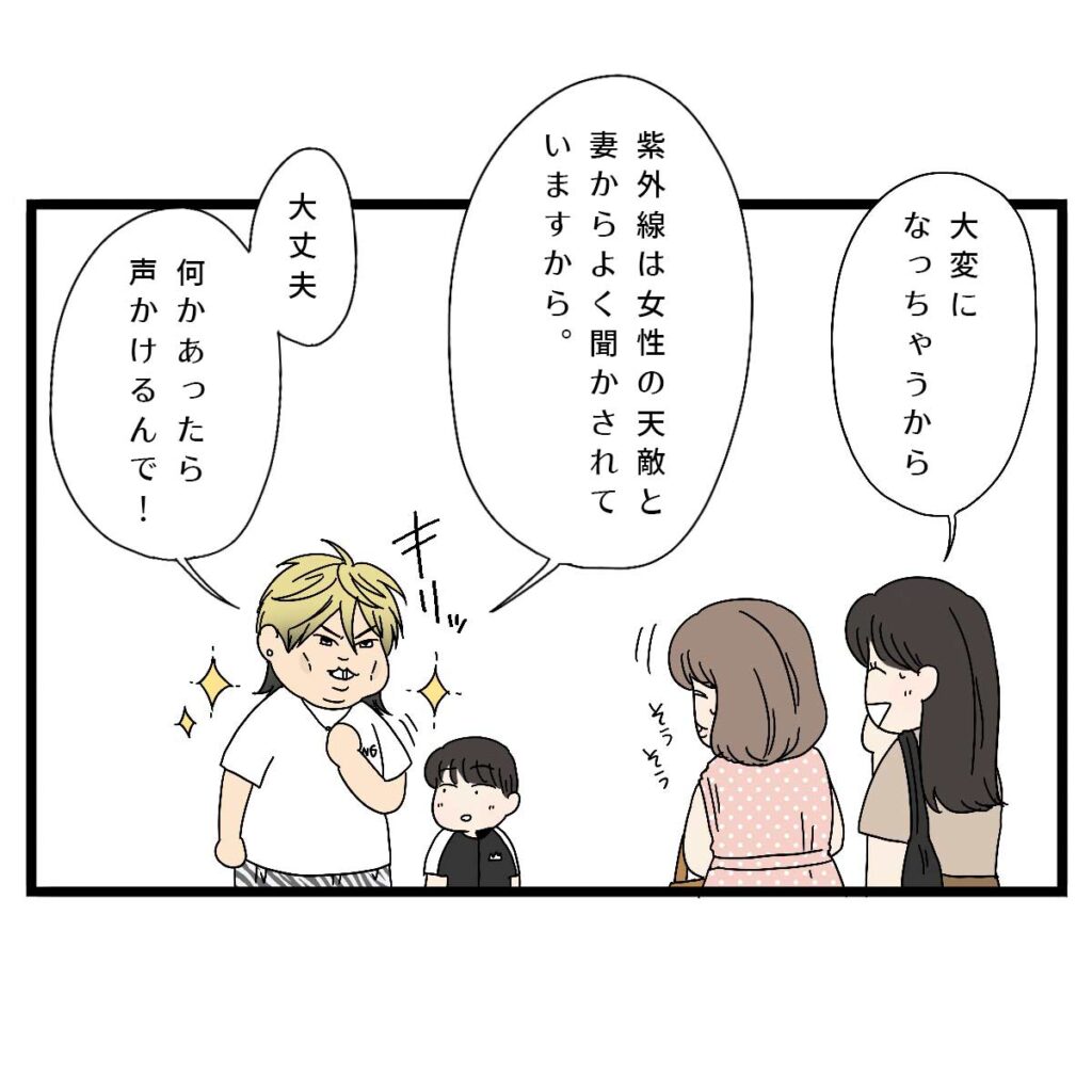 子どもたちを信也さんだけに見てもらうのは申し訳ないと思ったママさんたちは、大変になってしまうからと遠慮しましたが。信也さんは「紫外線は女性の天敵と妻からよく聞かされていますから。」サラリとかっこいいセリフ。何かあったら声をかけるから大丈夫、とキリリとしたキメ顔を見せるのでした。こんなパパ見たことないとでも言いたげに、コウキくんが不思議そうに信也さんを見上げていましたが、そんなことはお構いなしの信也さんです。