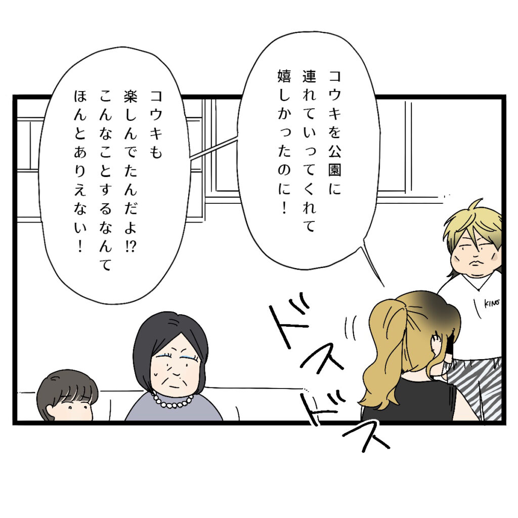 サチさんは信也さんに詰め寄ると「コウキを公園に連れて行ってくれて嬉しかったのに!コウキも楽しんでたんだよ!?こんなことするなんてほんとありえない!」と責め立てました。